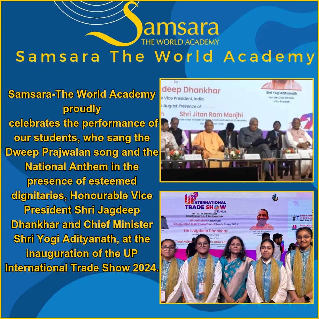 Samsara-The World Academy proudly participated in the inauguration ceremony of the UP International Trade Show (2nd edition) held at the India Expo Centre and Mart, Greater Noida, on 25th September 2024. Under the guidance of our Vocal Music teacher, Ms. Sarita Deshmukh, our talented students sang the National Anthem with impeccable tone and rhythm in the esteemed presence of the Honourable Vice President, Shri Jagdeep Dhankar, and the Chief Minister of Uttar Pradesh, Shri Yogi Adityanath, along with other distinguished guests.