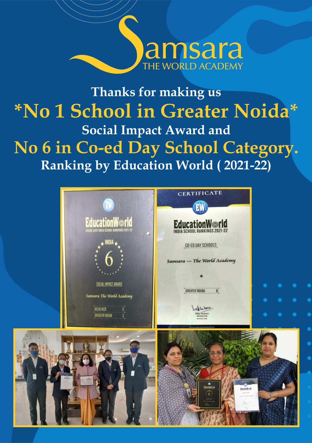 Samsara The World Academy is once again the proud recipient of Grand Jury India School Rankings 2021-22 Award by achieving No 1 position in Greater Noida and No 6 Rank in India for Social Impact.