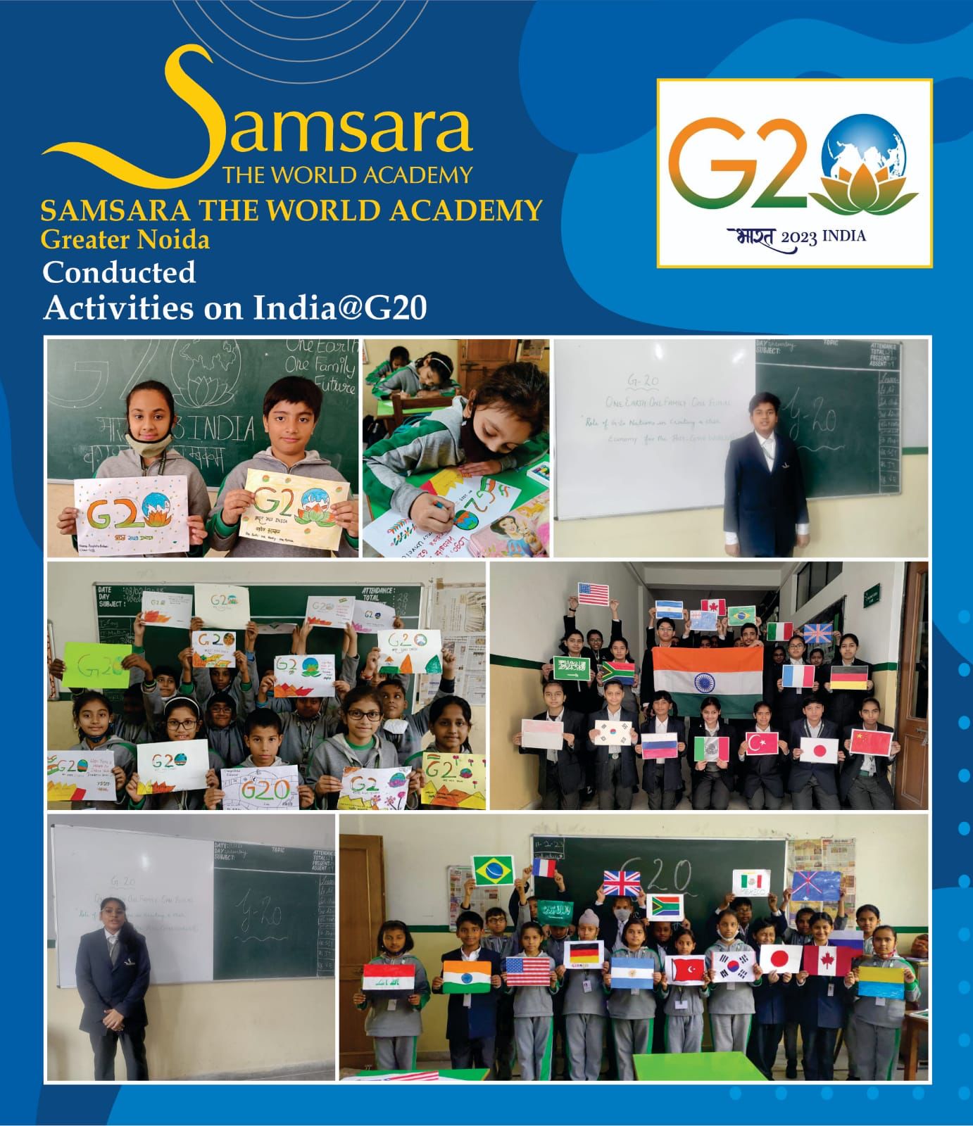 The students of Samsara- The World Academy participated in the G20 Summit activity 2023, organised by COE Noida last month during school hours. The theme of the summit was 'Vasudhaiva Kutumbakam' where the students showed interest and were told about the aim, objectives, and the members of the G20 Summit.
