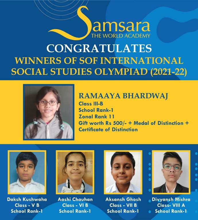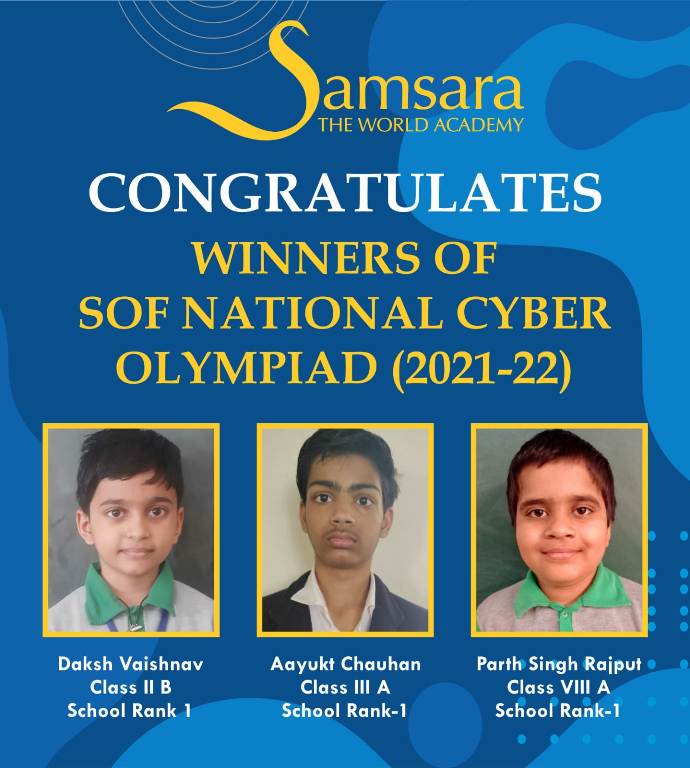 Samsara-The World Academy feels very glorious and delighted to announce that our students have brought laurels to us by securing First Rank at the school level in SOF Olympiad competitions of the Session 2021-2022.