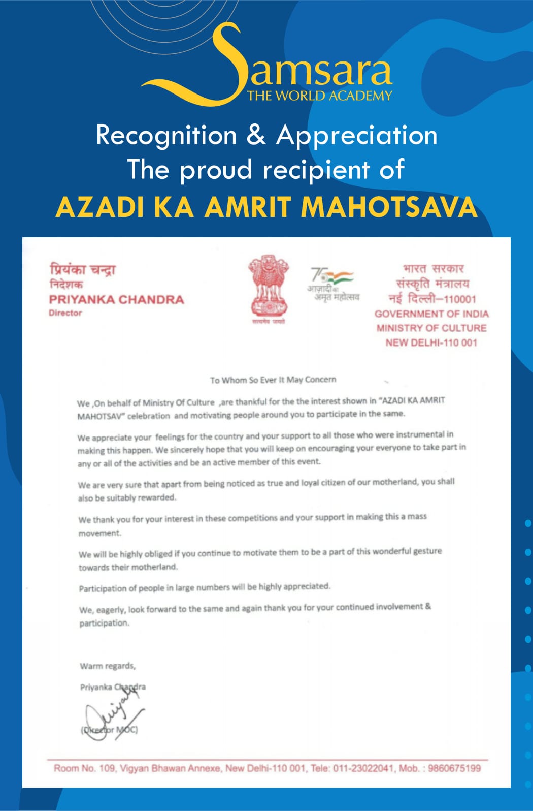 Ministry of Culture, GoI appreciated the efforts put in by Samsara The World Academy in participating enthusiastically and motivating students to participate in AZADI KA AMRIT MAHOTSAV. As a part of Azadi Ka Amrit Mahotsav, a plethora of activities was organised in the school in which a large number of students took part.