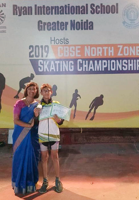 Rudra Pratap Singh, a student of Grade VI of Samsara -The World Academy, whirled the magic on wheels in CBSE North Zone -1 skating Championship, held at Greno International Bank track.