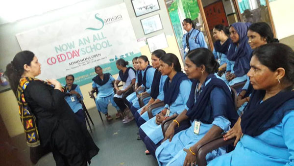 To educate and empower the house keeping staff in basic etiquettes and mannerism, a workshop was conducted by Ms. Shivani Dhingra on 29th June 2019 at Samsara The World Academy.She encouraged them to adopt a professional attitude in the way they conduct themselves such as tying their hair in a bun, to pin up their dupattas properly, to walk and talk in the most polite way ,suitable to the school environment. They were also trained about table manners as to how to serve water or lay table for lunch or breakfast for guest in the school. This work shop will definitely enhance their personality.