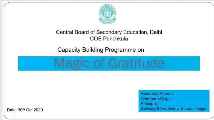 Our PrePrimary Facilitator Ms. Vandana.V.Kaushish attended an online Capacity Building Programme on 'Magic of Gratitude' organised by CBSE, CoE, Punchkula on 30th, Oct 2020.