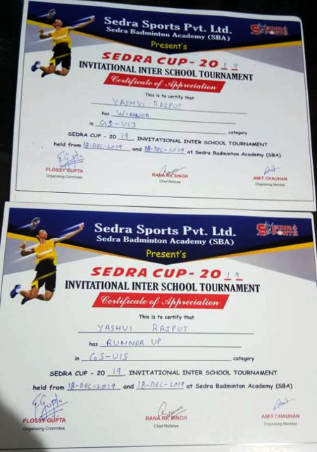 Our young Badminton champion, Yashvi Rajput is adding to our sporting glory and trophy cabinet. She bagged the Winner’s Trophy in U-13 and the Runner’s Trophy in U-15 category in Sedra Cup-2019 held at Greater Noida, on Tuesday, 18th December.