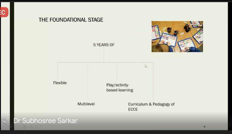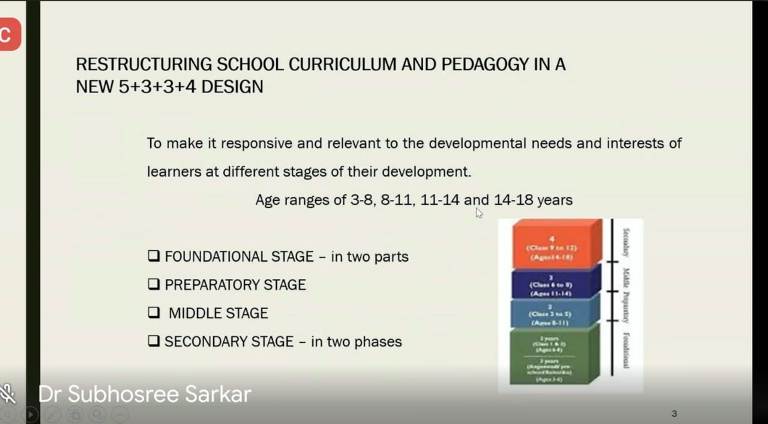 The main objective of the training session was to make the participants aware about the New Education Policy, its detailed curriculum & pedagogy which is based on holistic and integrated learning. The resource person Dr. Subhosree Sarkar explained at length about reconstructing school curriculum and pedagogy in a new 5+3+3+4 design. He told that this design is to make it responsive and relevant to the developmental needs and interests of learners at different stages of their growth. He talked about various levels - Foundational stage, Preparatory stage, Middle stage and Secondary stage and the age ranges of 3-8, 8-11, 11-14 and 14-18 years.
