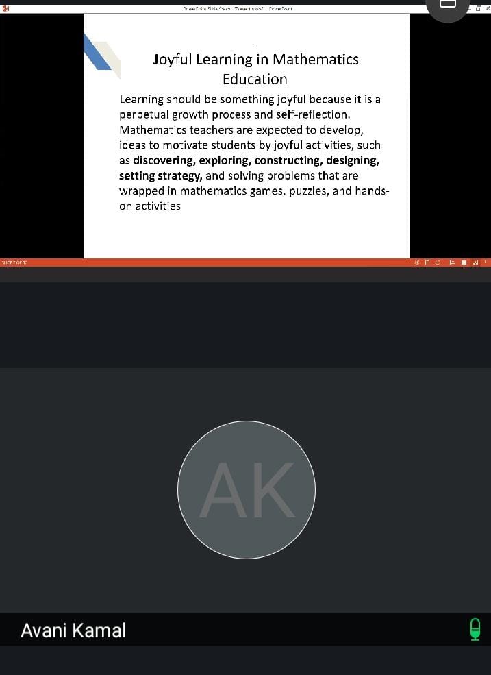 The resource person Mr. Avni Kamal explained the participants about joyful learning which is a perpetual growth process and self reflection.He encouraged the teachers to develop ideas to motivate students by joyful activities such as discovering,exploring, constructing, designing, setting strategies and solving problems that are wrapped in mathematics games, puzzles and hands on activities.